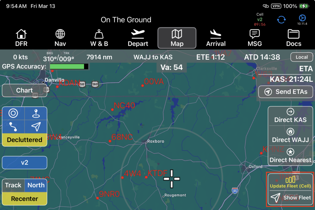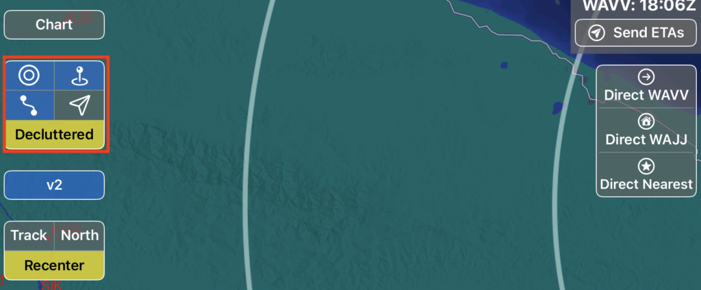 - Declutter by hiding shorter runways. (Note: when the button is labeled ‘Decluttered’ and is yellow, this indicates that some airports with shorter runways are currently hidden from view to declutter the map. Tap the button to view all airports.)