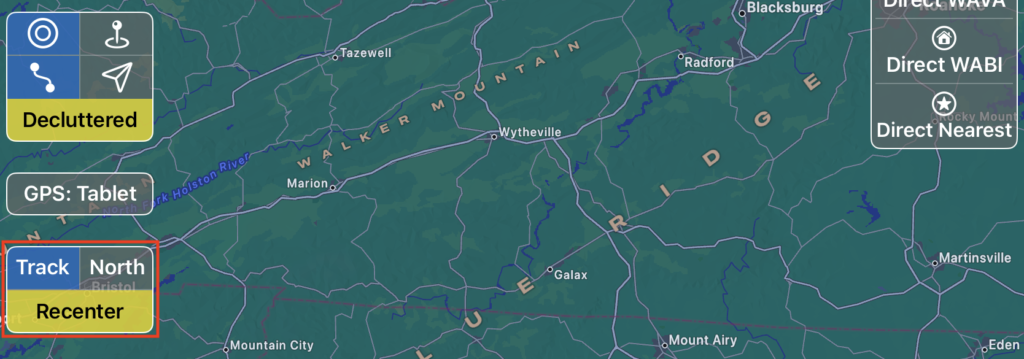 When the map is off center, the Centered button will be relabeled Recenter and will turn yellow. Tap to recenter on your current position.