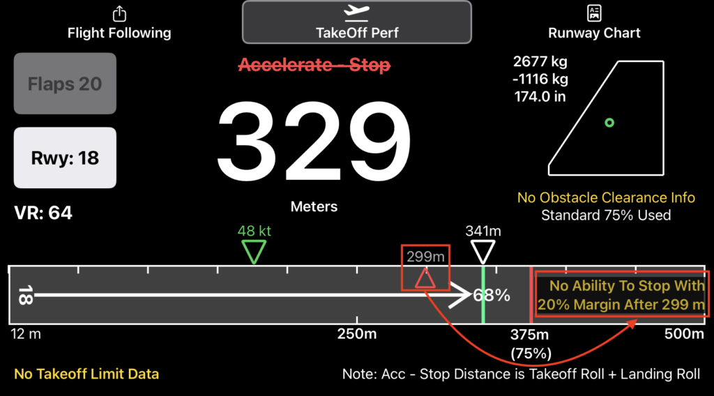 If the calculations determine that you cannot accelerate to liftoff speed and get stopped on the runway with margin, that point will be marked with a red triangle. The abort point distance is noted above the marker and in the “No Ability to Stop” warning (in this case, 299 meters).
