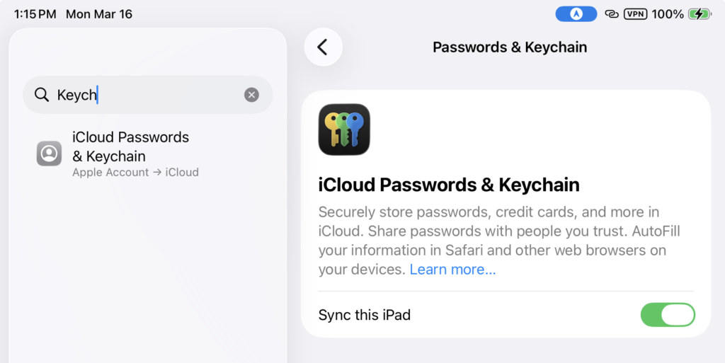 From iPad Settings, search for and select Keychain, then switch on Sync this iPad.