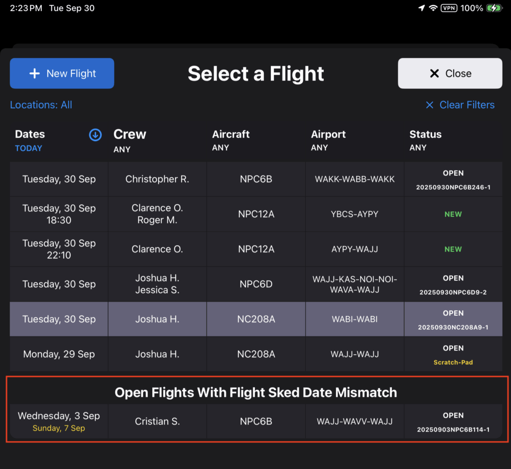 Any open flight with a date that doesn’t match what’s in FlightSpan™ Ops will always be displayed.