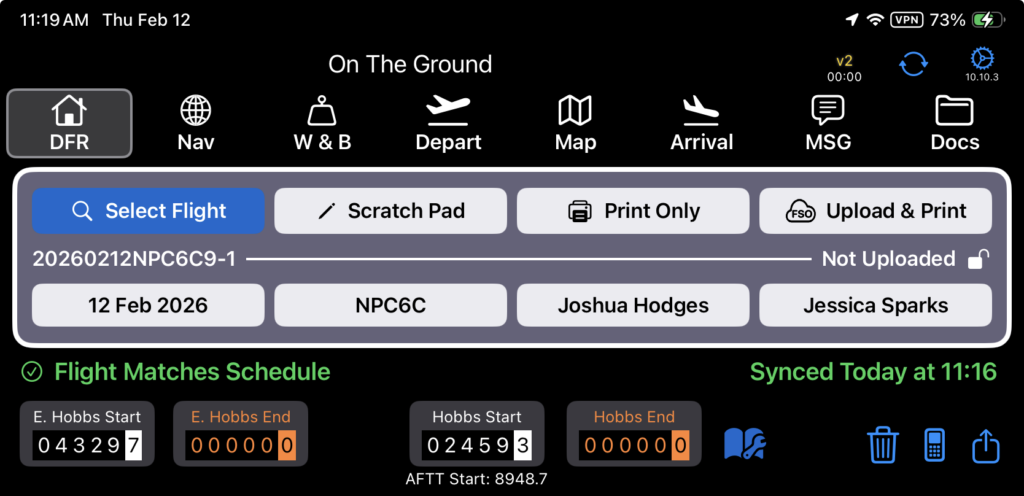 Tap on the pilot name to change pilots. Tap on (2nd Crew) to add another crew member.