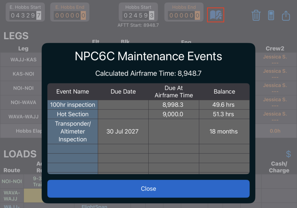 If there are any recorded maintenance events, a maintenance logbook icon will be visible to the right of aircraft Hobbs.