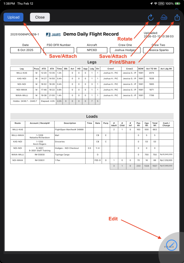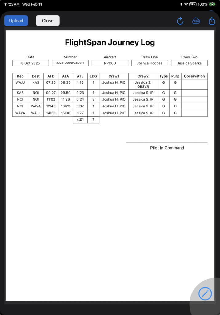 If you want to sign this or any other upload document or hand write any notes, tap the pencil icon, then tap either the Upload or FSO button to save the changes and attach to the flight.
