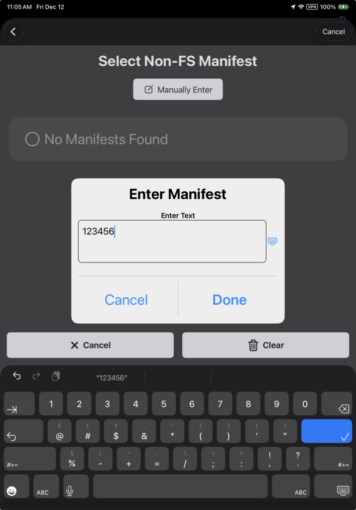 If you select the FlightSpan Manifest load type and none are found, or if you select Other Manifest as the load type, manually enter the manifest number, then tap Done.