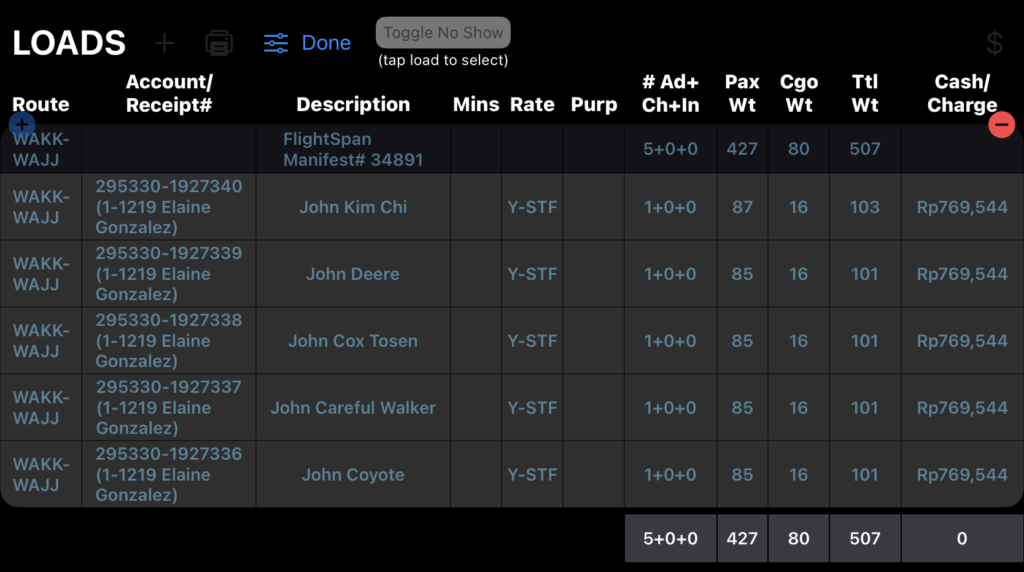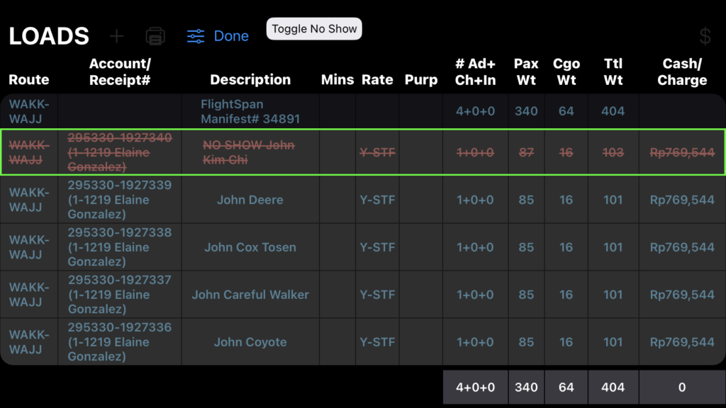 If you have tapped the Loads Adjustments icon, tapping on any load will highlight the load. After highlighting a desired load, you can tap the Toggle No Show button to mark the load as a No Show.