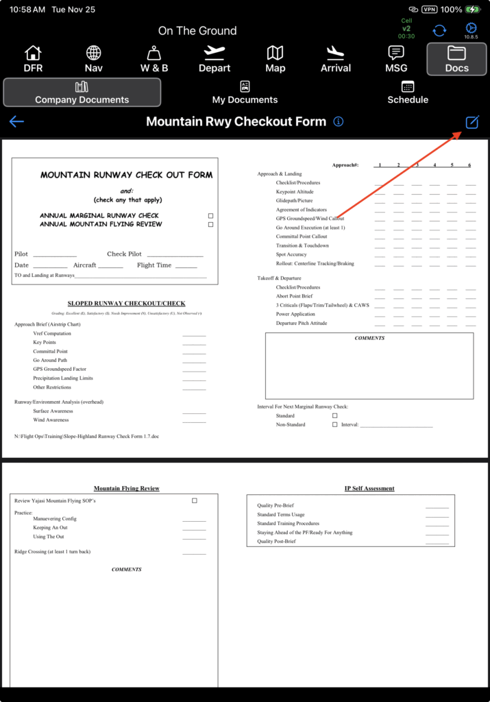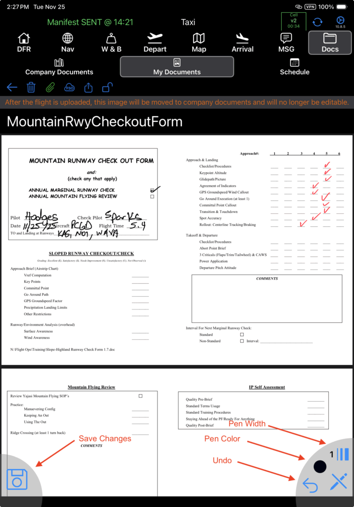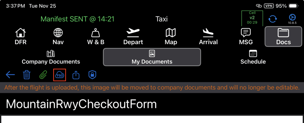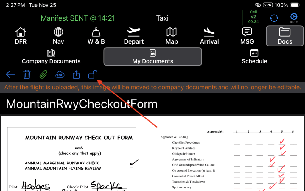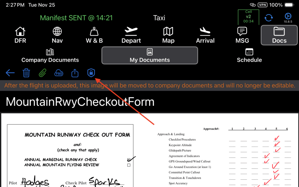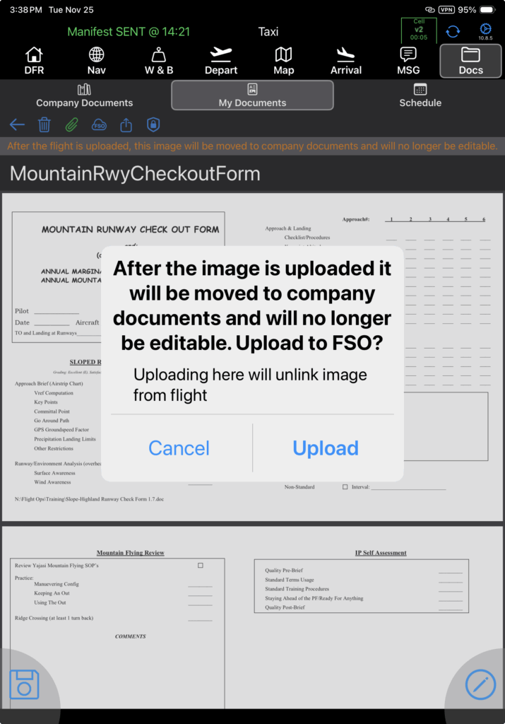 If you are connected to the internet, the document will be uploaded to the FlightSpan™ Ops Documents List. On the EFB it will be removed from My Documents, and added to the Company Documents section.