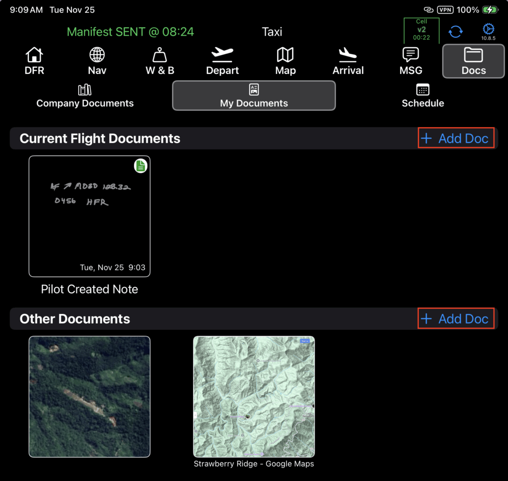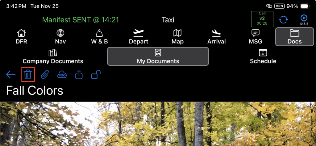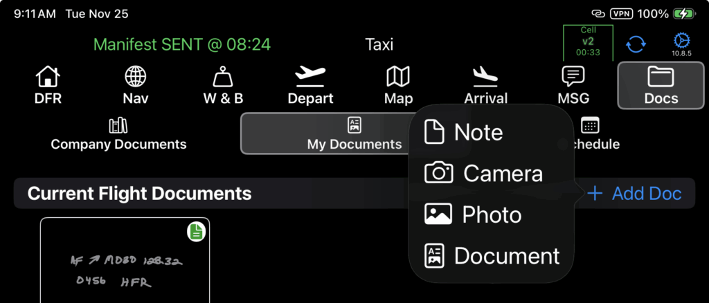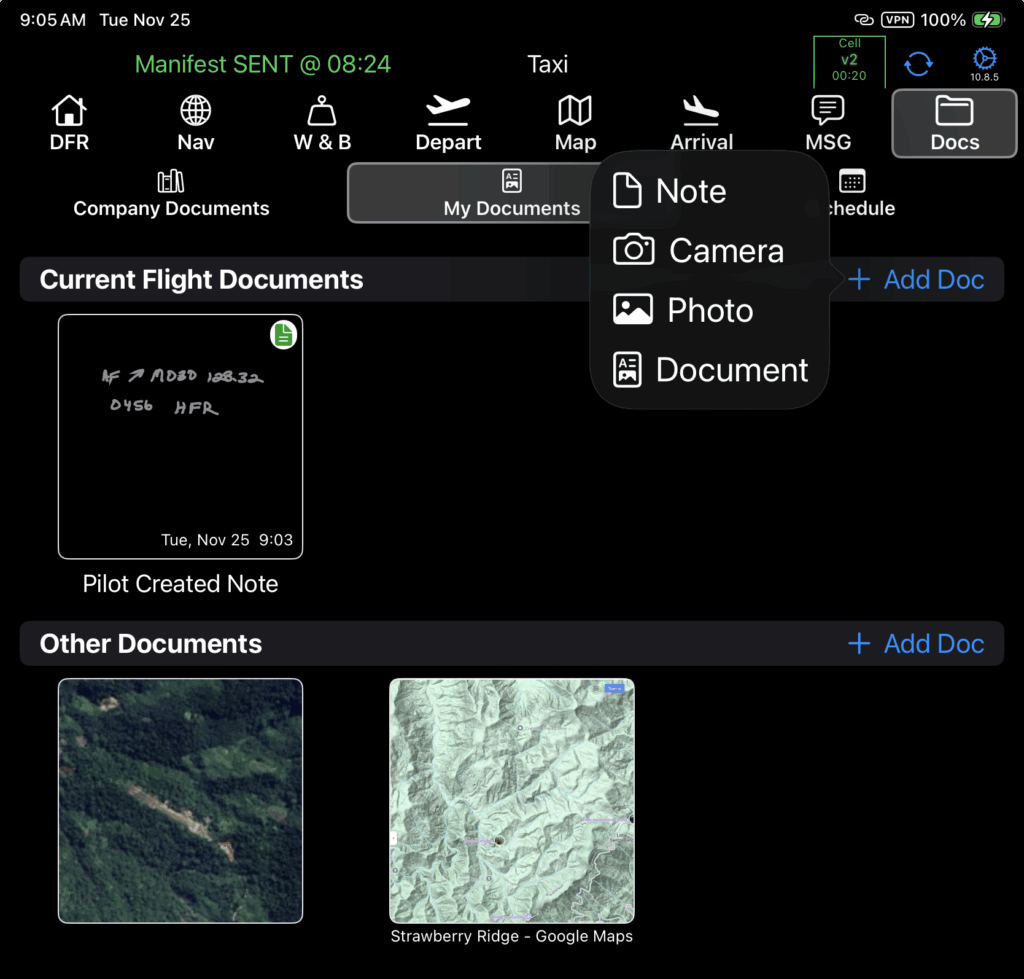 Tap the link under Current Flight Documents if you want it attached to the current flight; tap the link under Other Documents if you do not want it linked to the current flight.