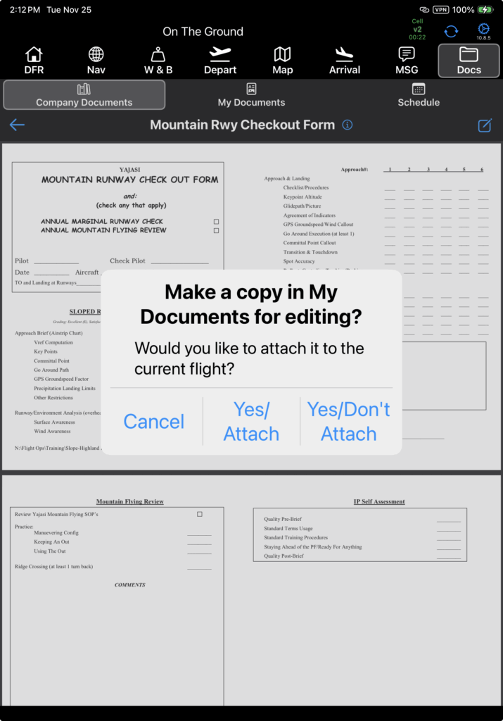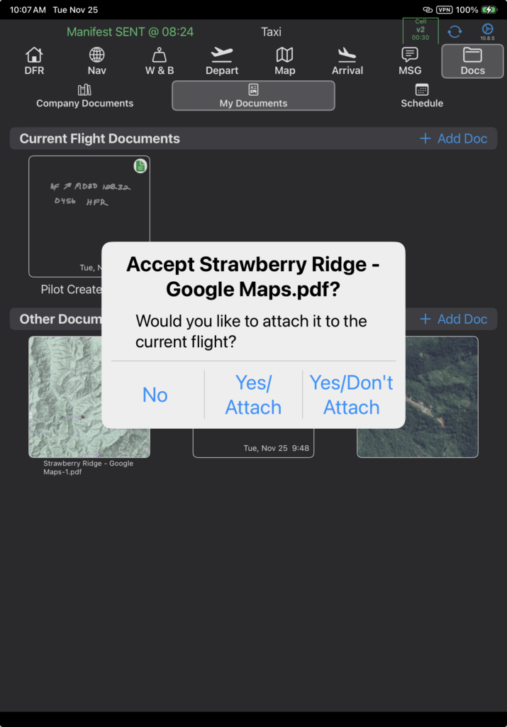 Select Yes/Attach to add to Current Flight Documents; select Yes/Don’t Attach to copy to Other Documents.