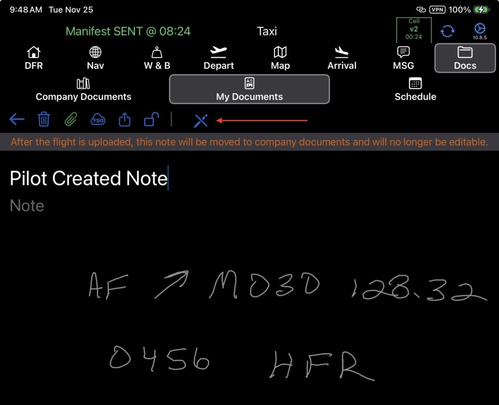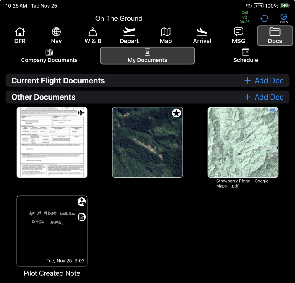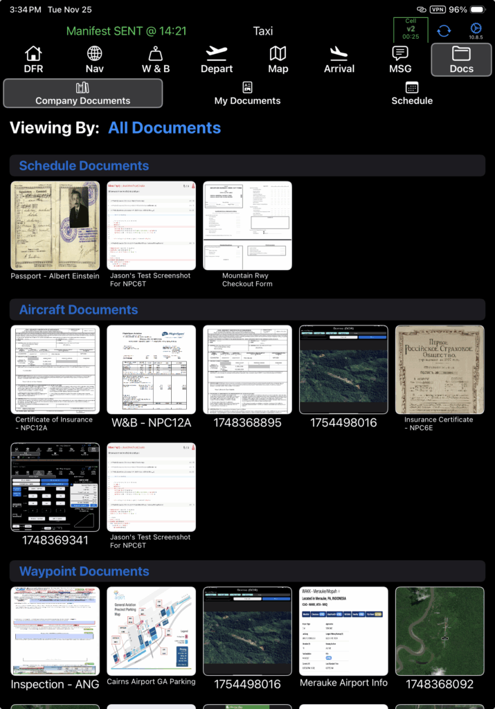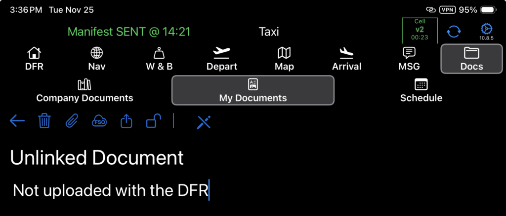 My Documents are documents created locally on the iPad. Attaching one of these locally created documents to a flight, crew member currency event, aircraft or waypoint moves the document out of the My Documents section and into the Company Documents section, and that document will (after syncing) then be available on both the EFB and FlightSpan Ops.