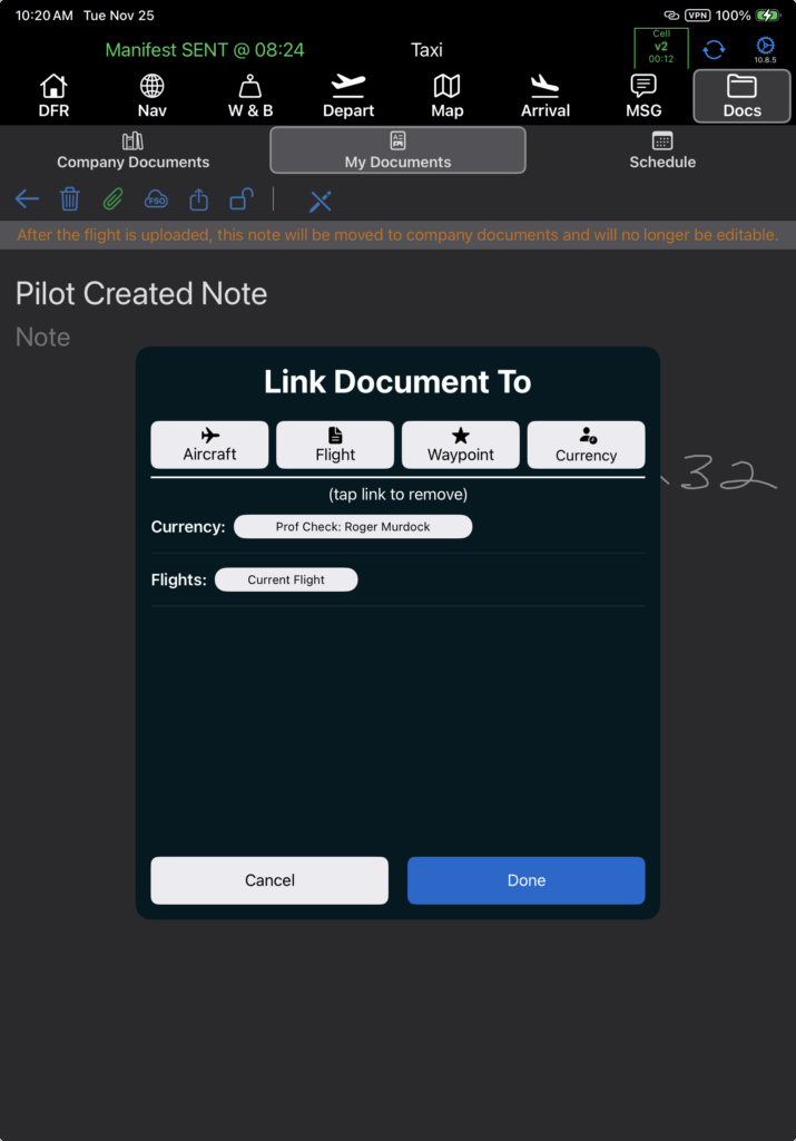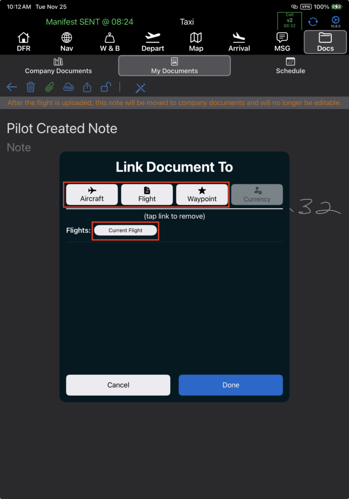 Tap existing links to unlink the document; to link the document, select Aircraft, Flight, Waypoint, or Currency (for currency events).