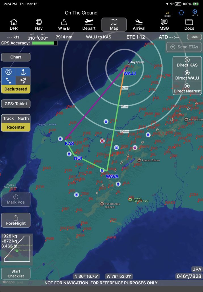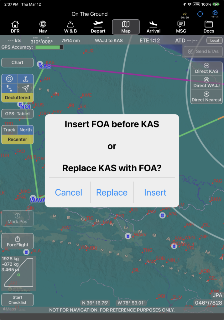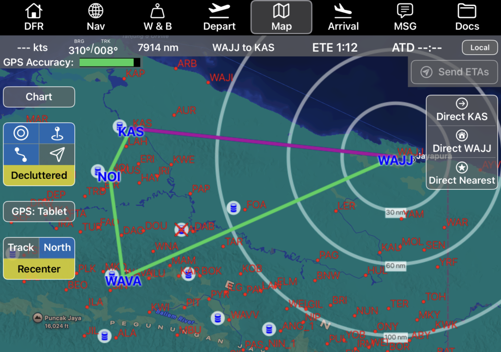 Waypoints included in the route are displayed in blue, and identifiers for other airports in the database are displayed in red.