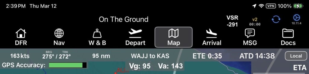 - Vertical Speed Required to the destination is at the very top next to the v2 connection symbol (this is in the header and thus visible throughout the app)