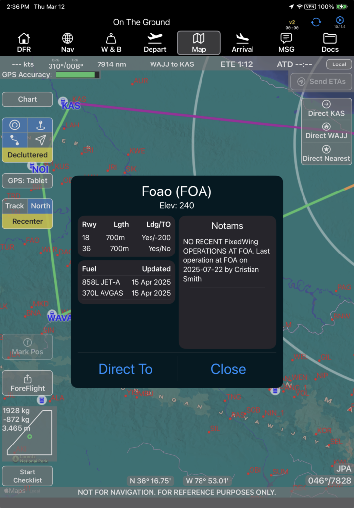 Tap the Direct To button to navigate to the selected airport, as described in the Map Tab – Right Side and Bottom documentation.