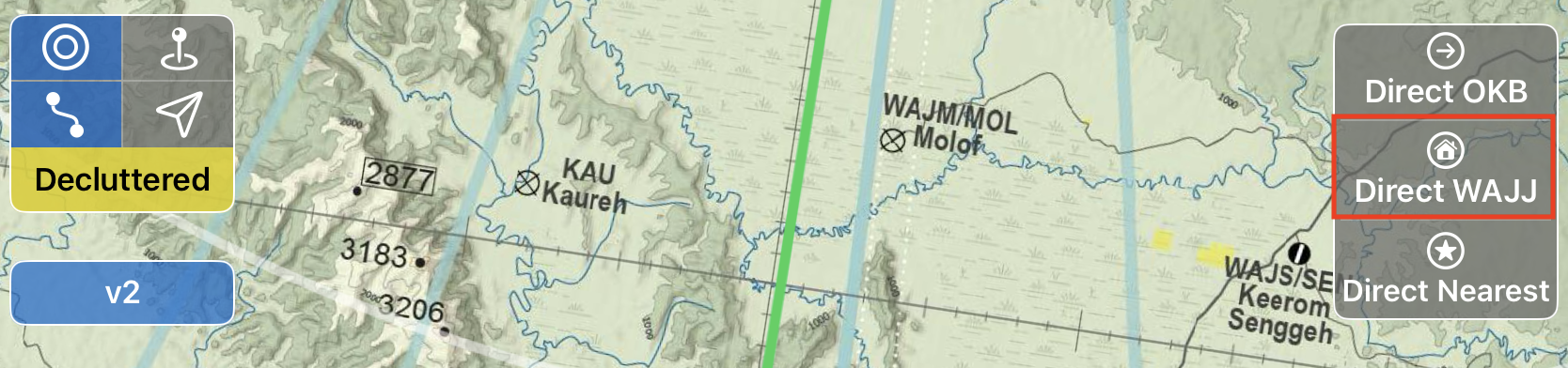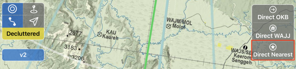 The first Direct button defaults to the next destination waypoint in your route. A new route line direct to the waypoint will be added to the chart without erasing the flight planned route line. A Cancel Direct button will also appear, which will erase the direct route line when tapped.
