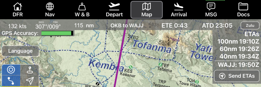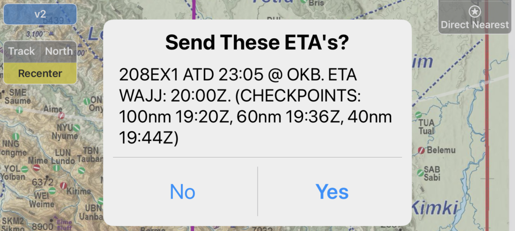 Note that the v2track web interface will have ETAs for your aircraft immediately after departure, but they are purely time-speed-distance computations and will be inaccurate while your aircraft is still in a climb. Using the Send ETAs button will send your Smart ETAs to the flight follower monitoring the v2track website.