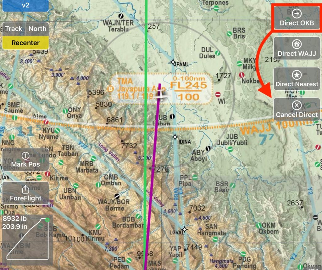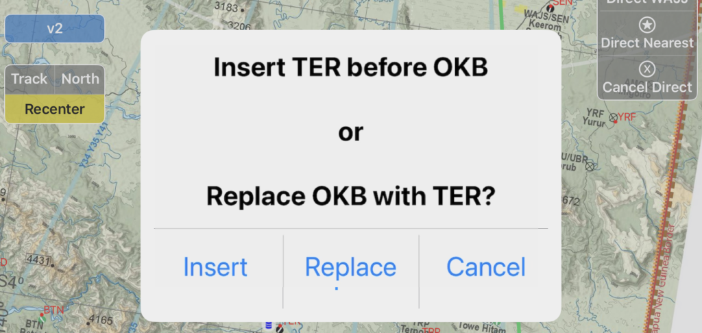 If you select replace, all the tabs will replace the original destination with the new one. In this example, Direct TER was selected while flying the WAJJ-OKB leg, eliminating OKB from the route.