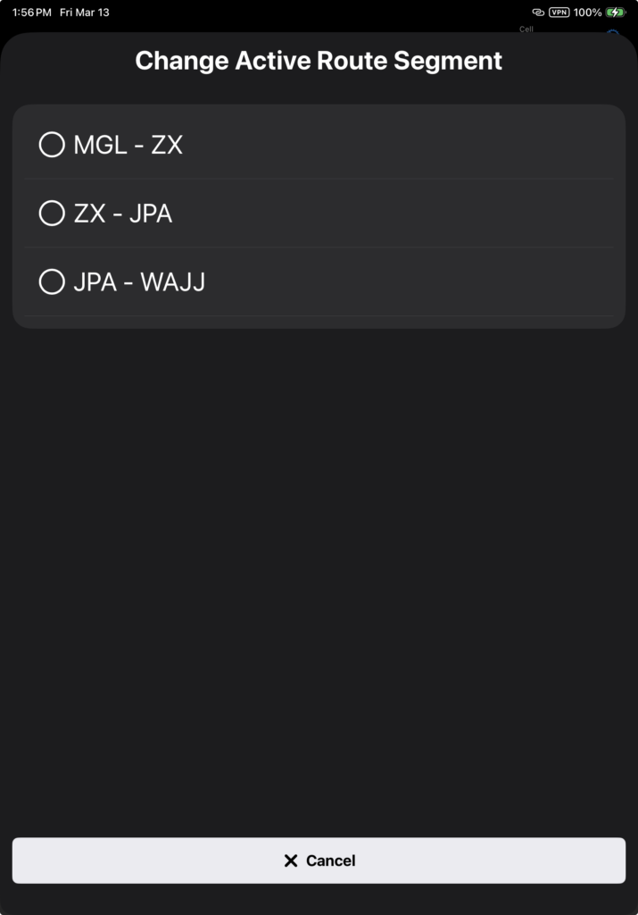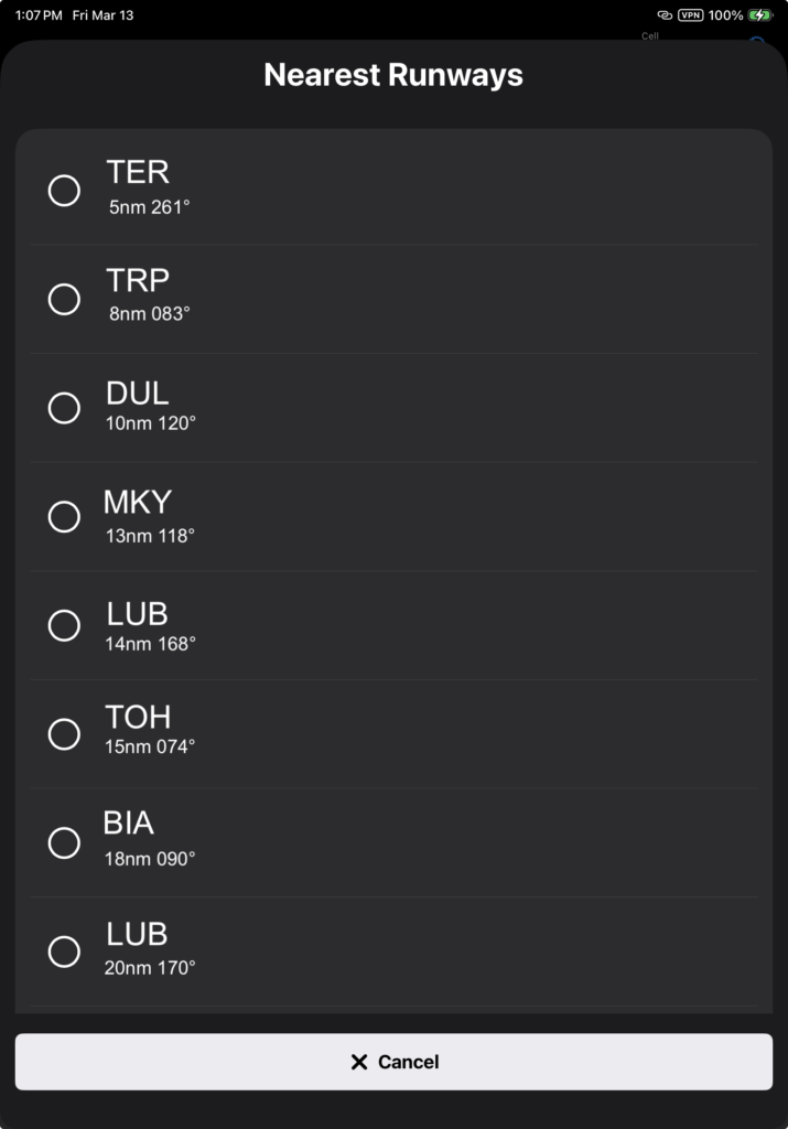 When you tap the button, a list of the ten nearest runways opens. Select from the list, or you can see the full list of runways by scrolling to the bottom and selecting See Full List, which takes you to the route planner screen.