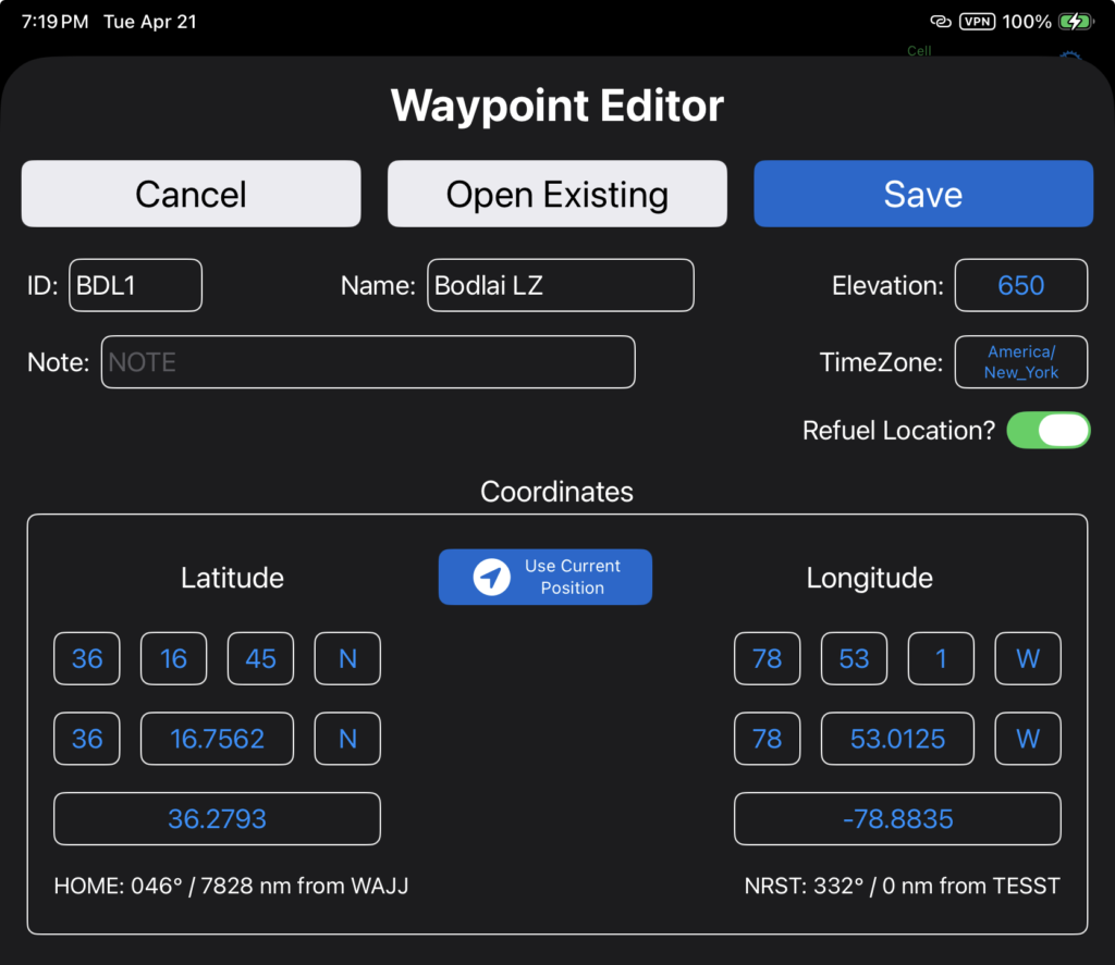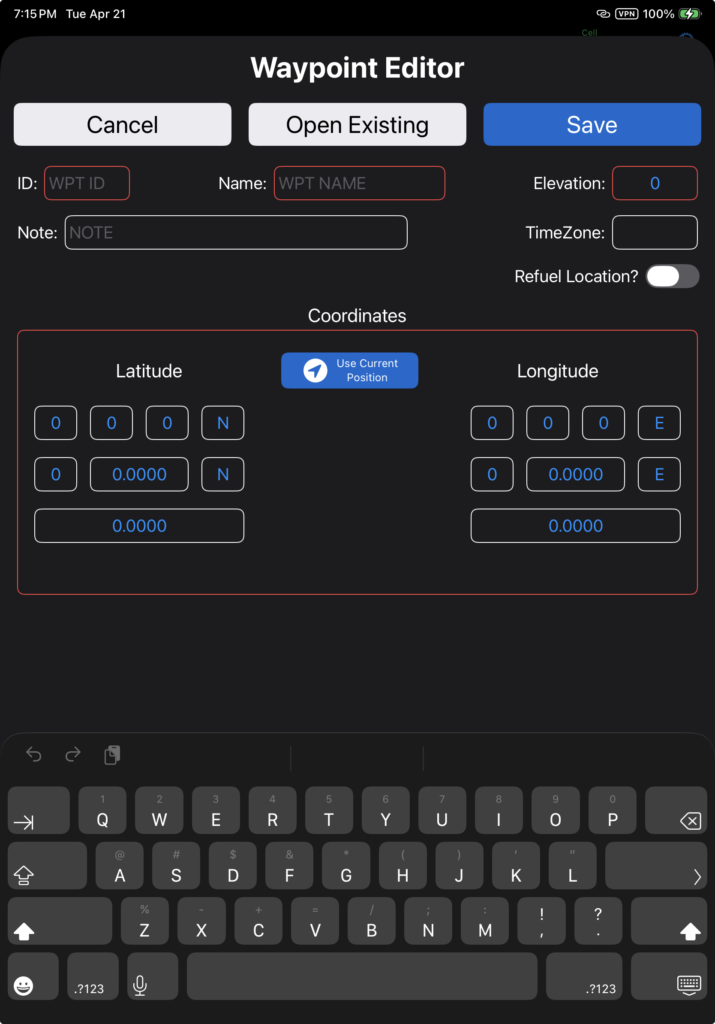 There is also an Add/Edit Waypoint button added to the Flight Legs planner screen. From either location, tap the button to open the Waypoint Editor.