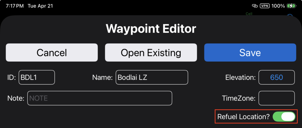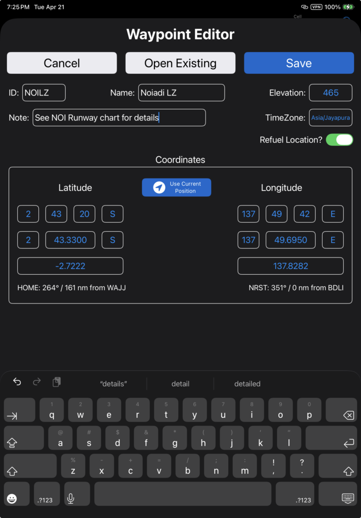 When you tap Save, the waypoint will be immediately available on the iPad for route planning, and will be uploaded to FlightSpan Ops when you upload your DFR or when the next data sync is performed.