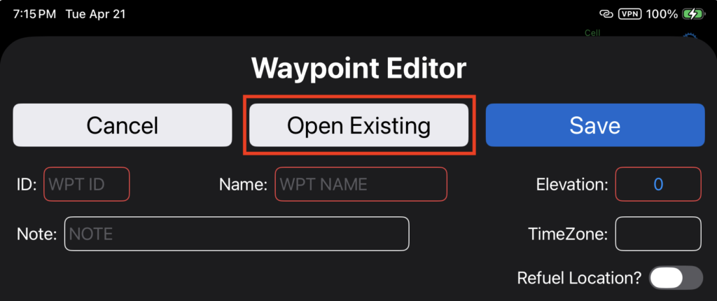To edit an existing waypoint, select Open Existing.