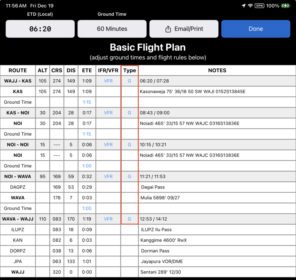 Tap on the type of flight in the Type column to change the type of flight for any given leg.