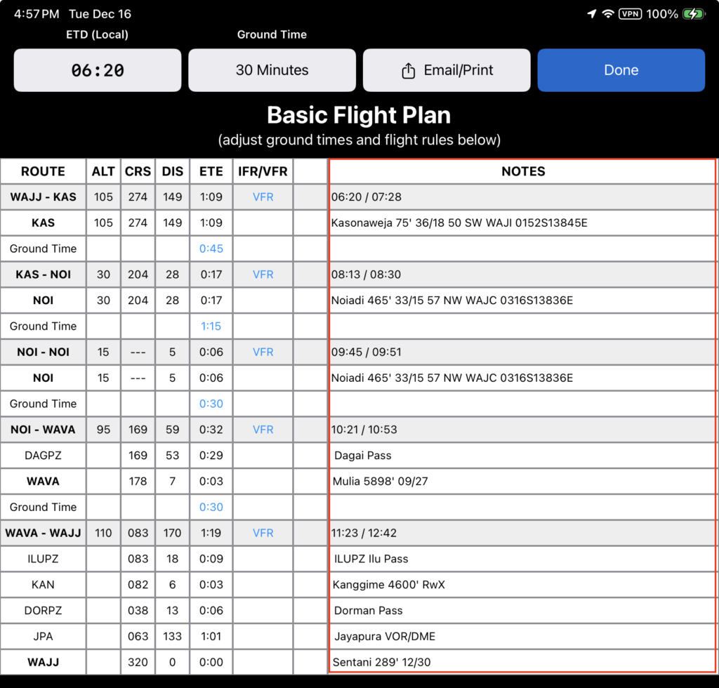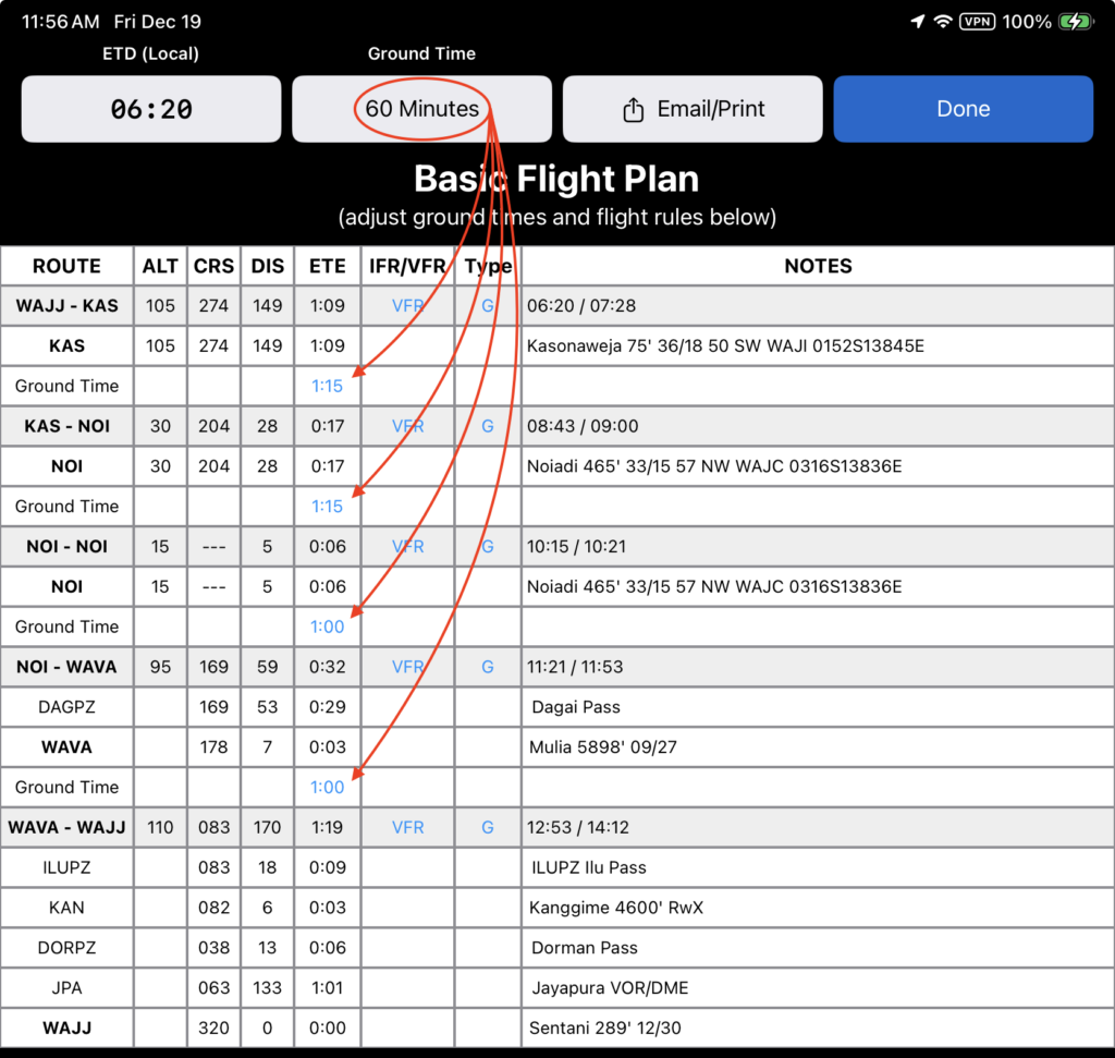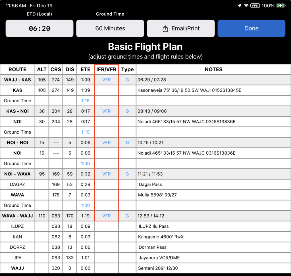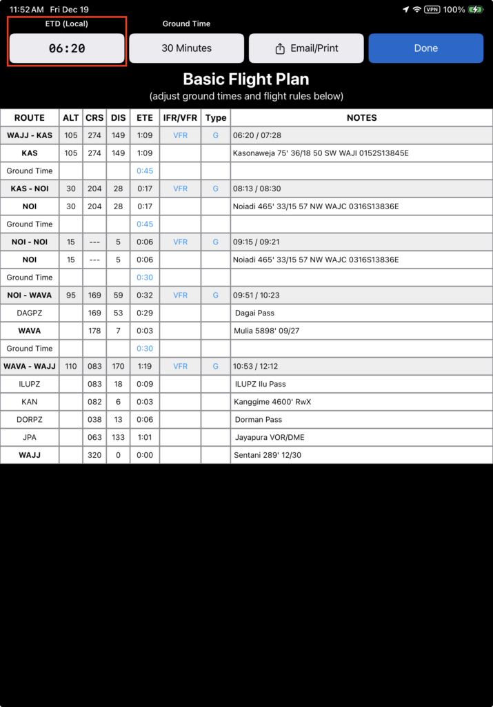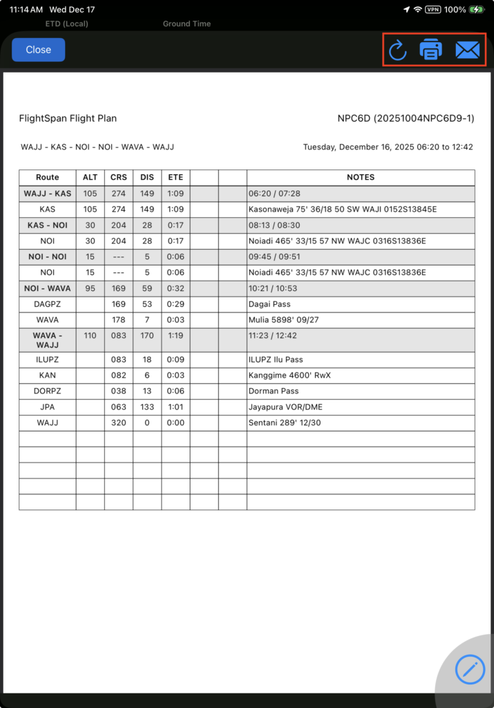 Note: To email your flight plan, Apple Mail must be set up on the iPad.