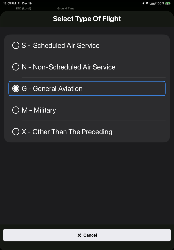 The Flight Plan ETD defaults to the scheduled departure time and date for flights downloaded from FlightSpan™ Ops, or 30 minutes from now for flights created on the iPad. Tap the ETD button to change the departure time and date.