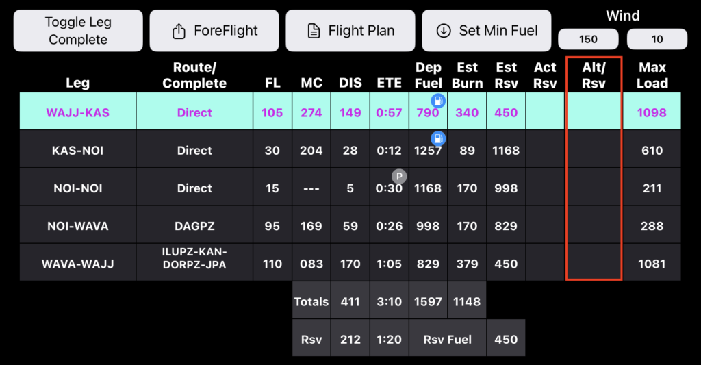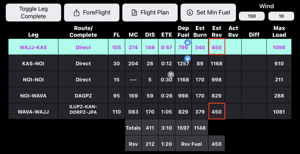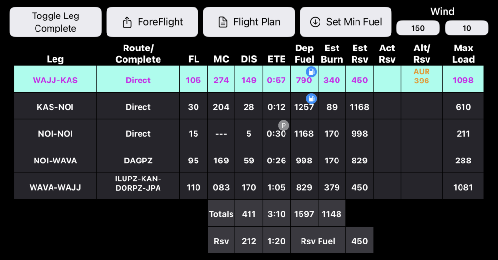 Tap Toggle Leg Complete to complete a row without entering fuel (see the KAS-NOI leg). Tap again to uncomplete. If Actual Reserve fuel was entered, it will be erased.
