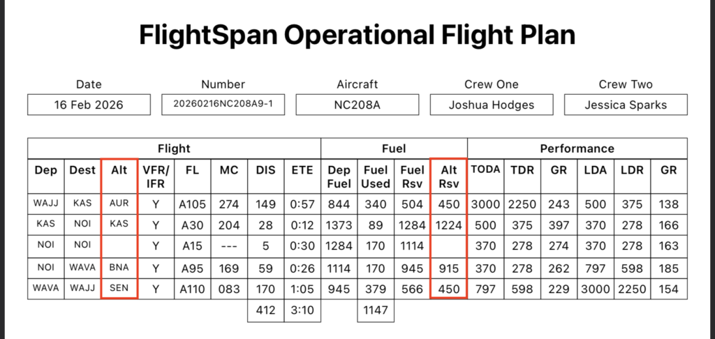 If the Aircraft Type EFB Preference Include Alternates on Nav Planner is set to Yes, the Difference column will be replaced with an Alternate/Reserve column.