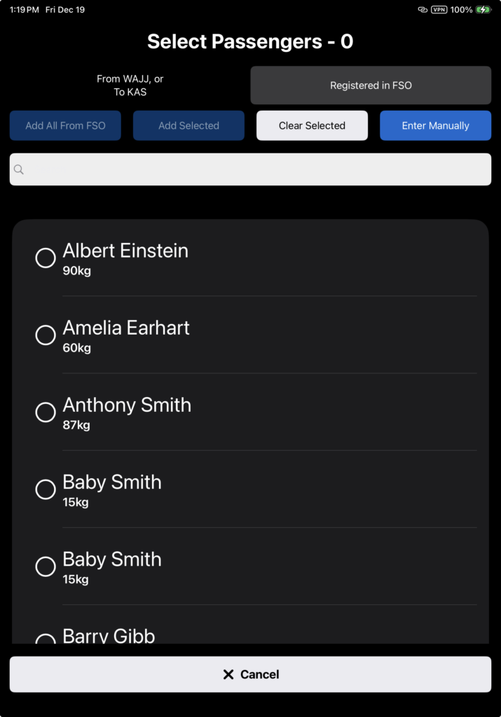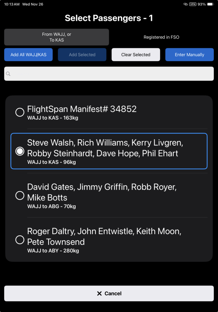 If you select Manually Enter, or if there are no loads on the DFR that include passengers, enter the passenger names in the window that opens, then tap Done.
