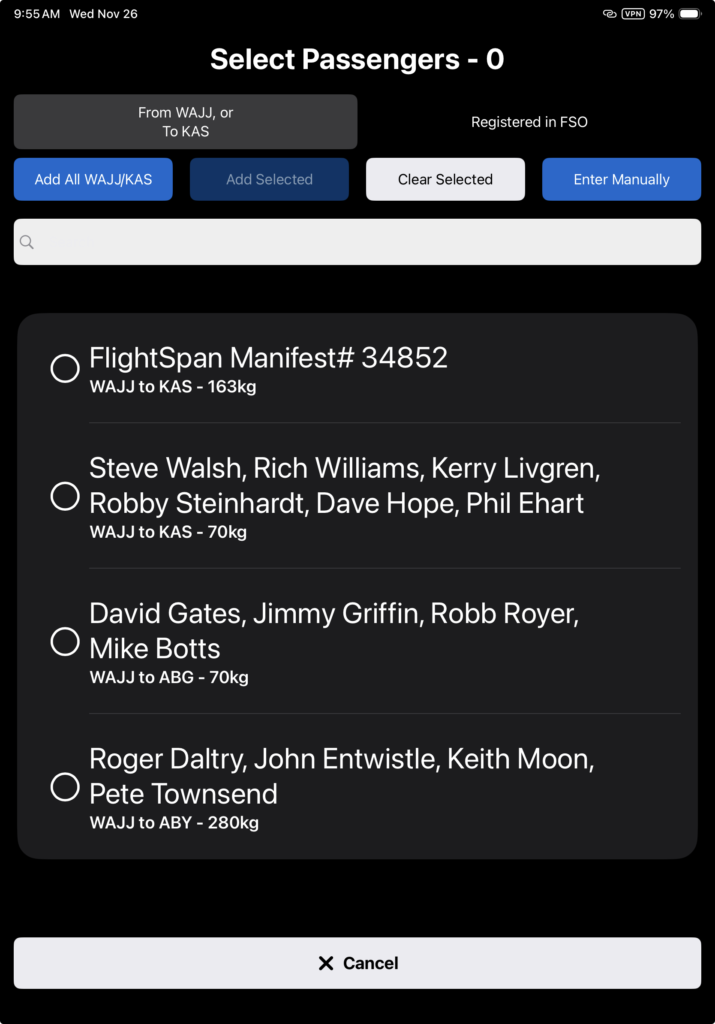All loads from the DFR page that include passengers traveling from your departure point or to your destination will be listed, including Flight Manifests with passengers.