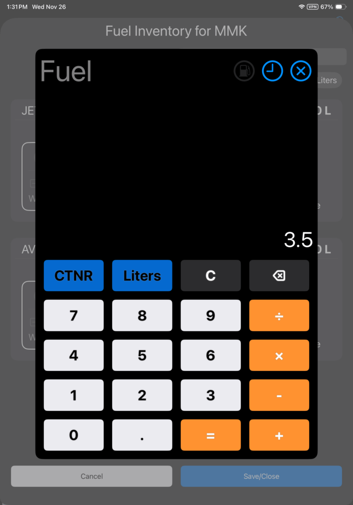 Record fuel by the container by entering the number of containers—in this example, barrels—with fuel, including a fraction of a container, then tap the CTNR button to tell the EFB that you’re entering the number of full containers.