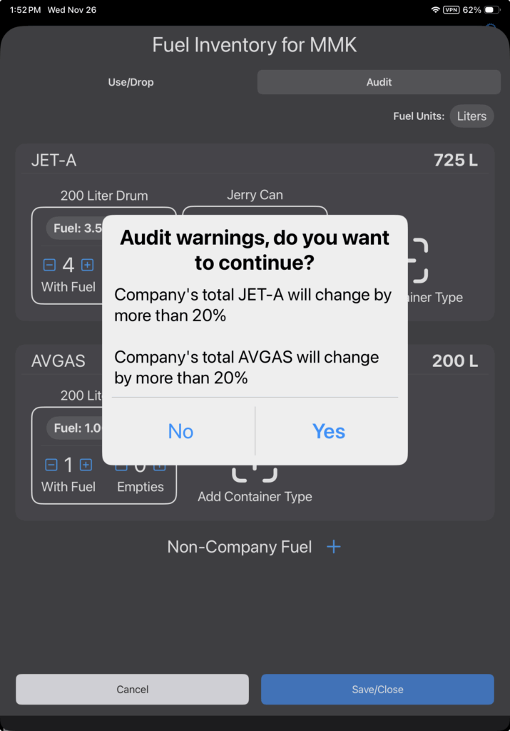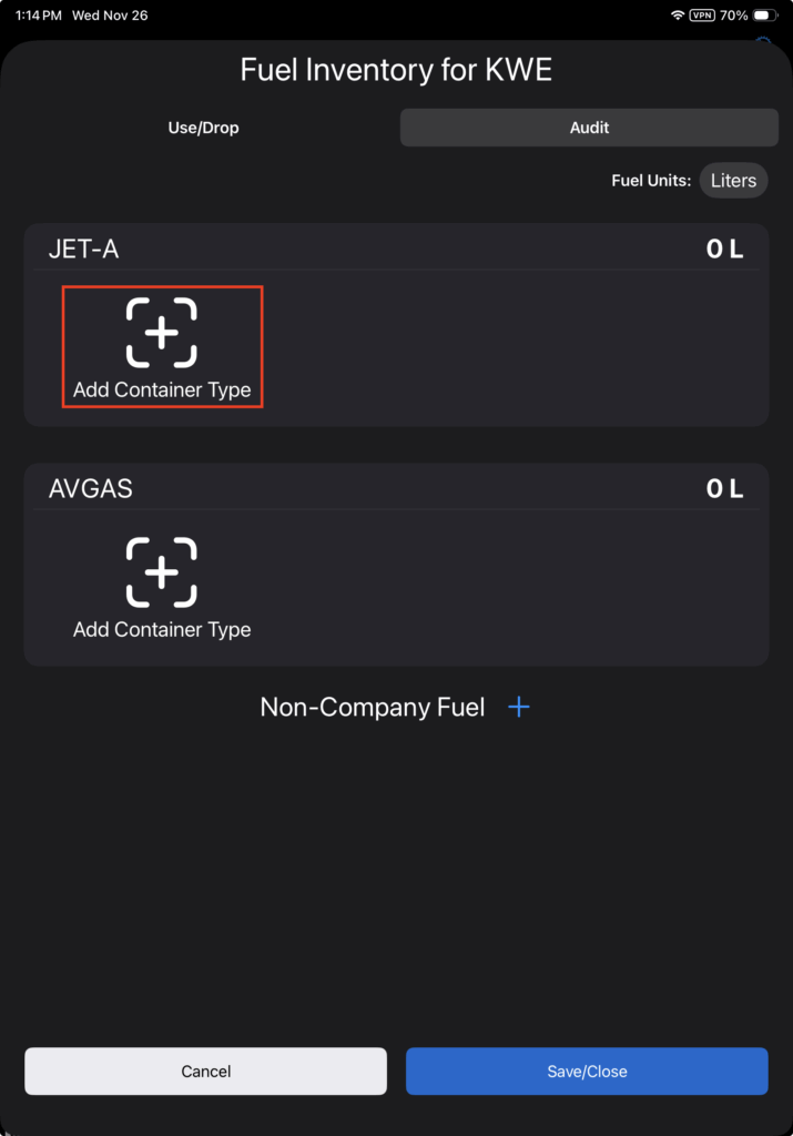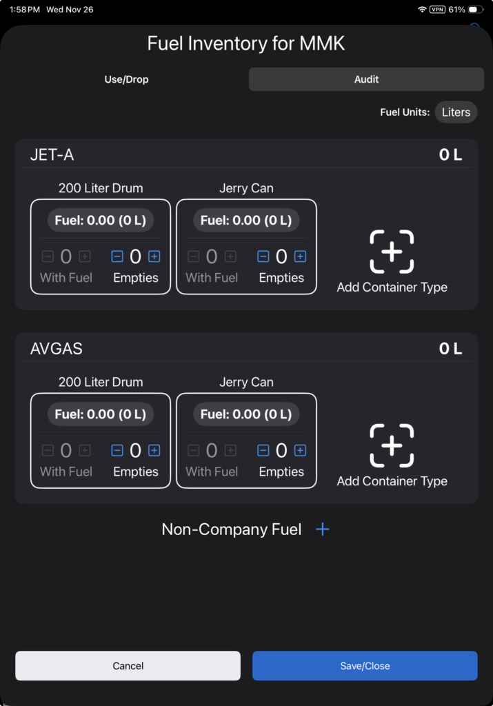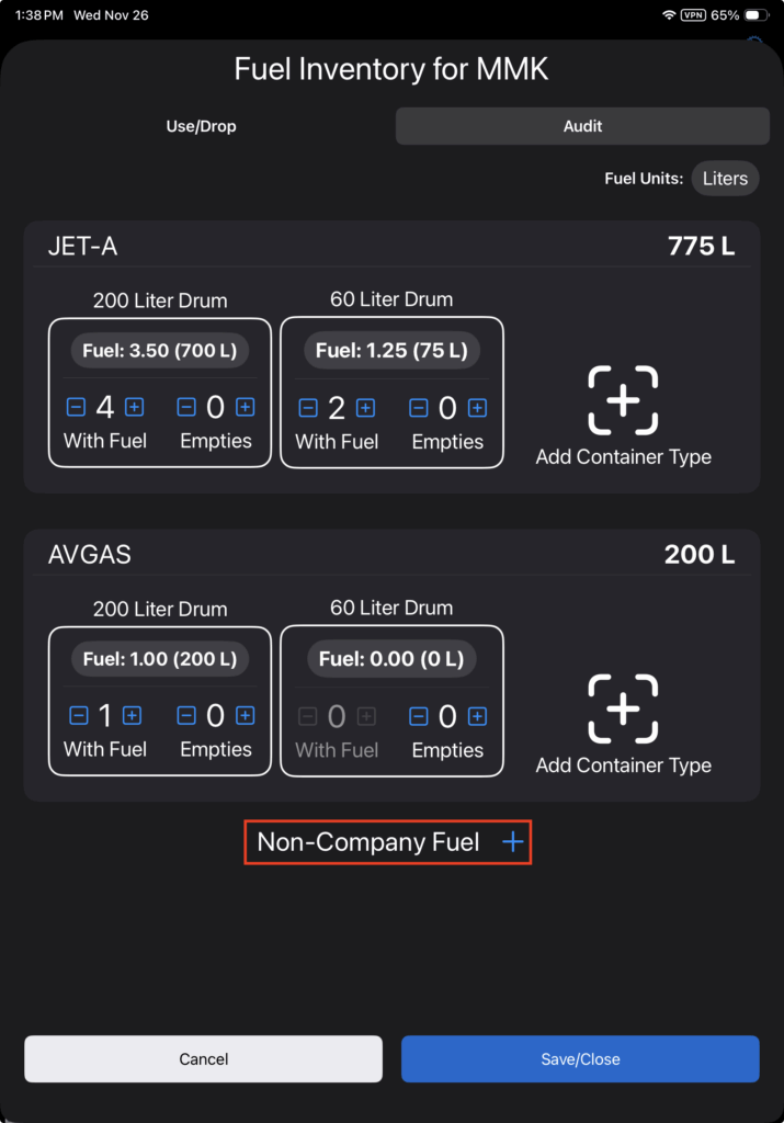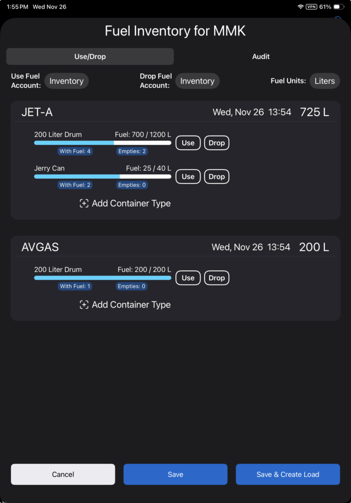 When you save the audit, the window will close, but the next time you tap the fuel barrel icon, the Use/Drop tab will display the quantities entered on the Audit tab.