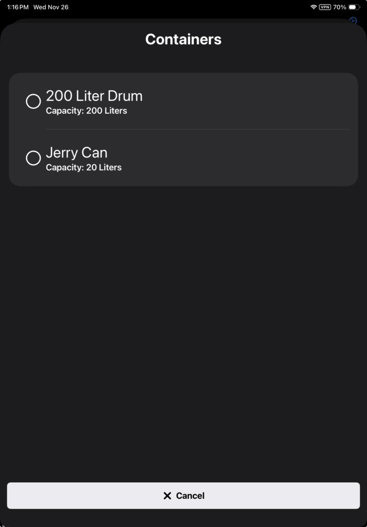 If you choose to enter the amount of fuel by volume, tap the Liters button and the EFB will convert this value into the appropriate number of fuel containers.