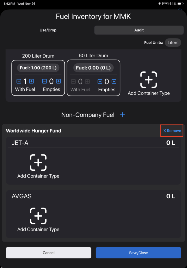 If you change your mind, and do not wish to audit other company fuel after all, tap the Remove button. Note that if you do not tap Remove, you will enter zero fuel for the non-company fuel when you save the audit.