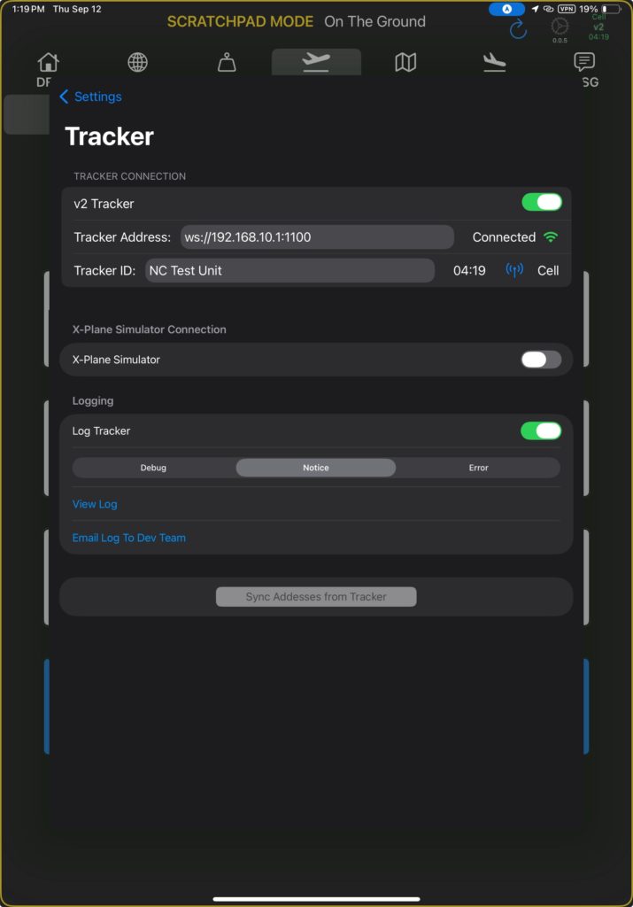 - Tap Sync Addresses from Tracker to force an update of any new contacts that have been entered in the v2Track website. Note that FlightSpan automatically updates the contact addresses when the app initially connects to the tracker.