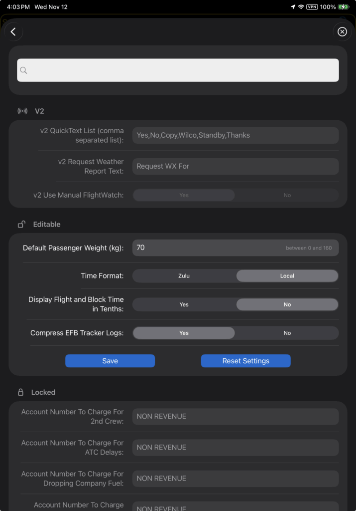 Only a few preferences that are not locked can be changed for this iPad. FlightSpan™ will retain the settings until you tap Reset Settings, or until the next time you log out