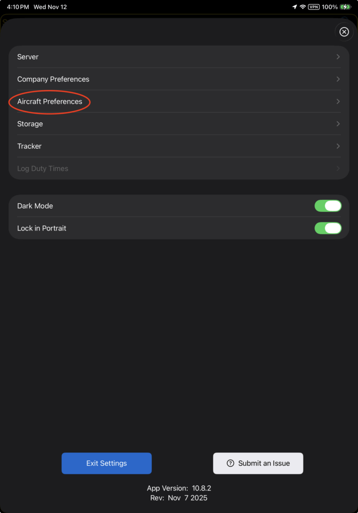 Aircraft Preferences are also set in FlightSpan™ Ops, but can be viewed here, and some preferences can be changed for this iPad.