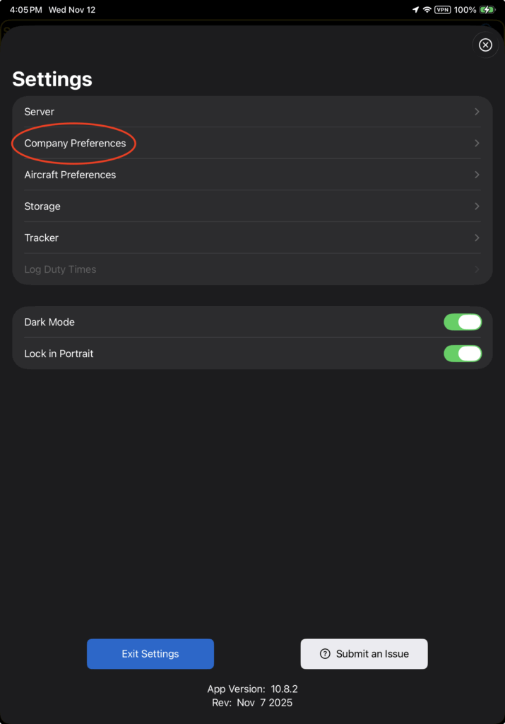 Company Preferences are set in FlightSpan™ Ops, and can be viewed here. See the EFB Preferences documentation for details.