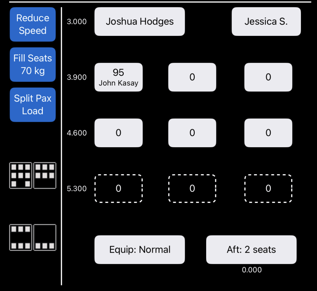 Single tap a seat to add a passenger using the default weight. Tap a second time to remove the passenger.