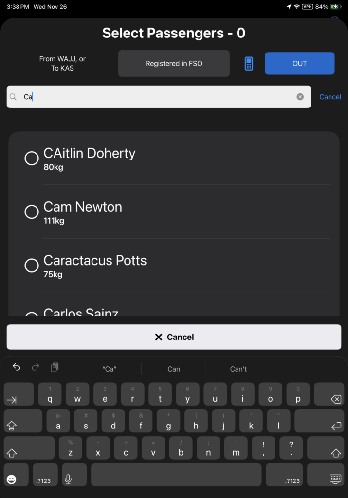 If you want to enter a custom weight without a name, tap the calculator icon, and if you want to remove a seat, tap the Out button.