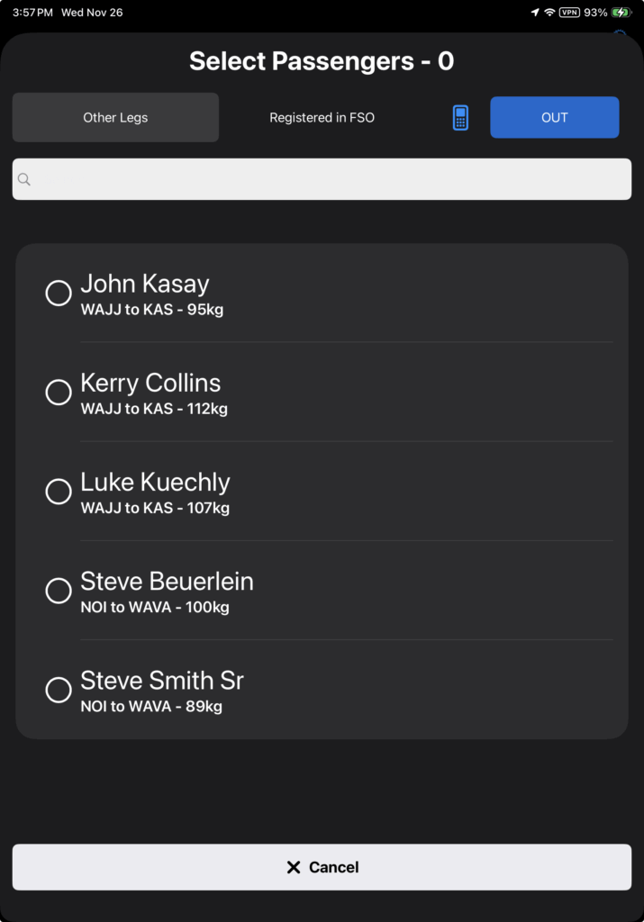 If you do not see the passenger you want, select the Registered in FSO tab, and search for and select the desired passenger.