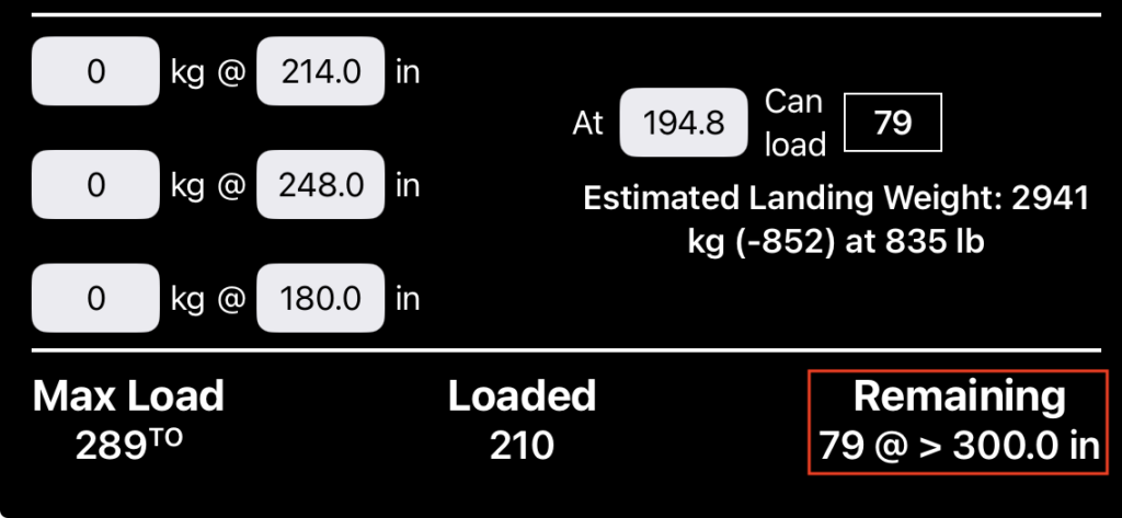 The Remaining number displays the maximum weight that can be loaded without exceeding a takeoff or landing weight limitation. When a specific station is indicated, loading the maximum weight at that station will put the CG at the aft limit.