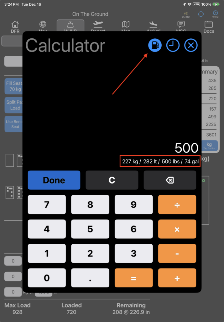 Tap the fuel pump icon in the upper right to display the amount in the calculator in all four fuel units.