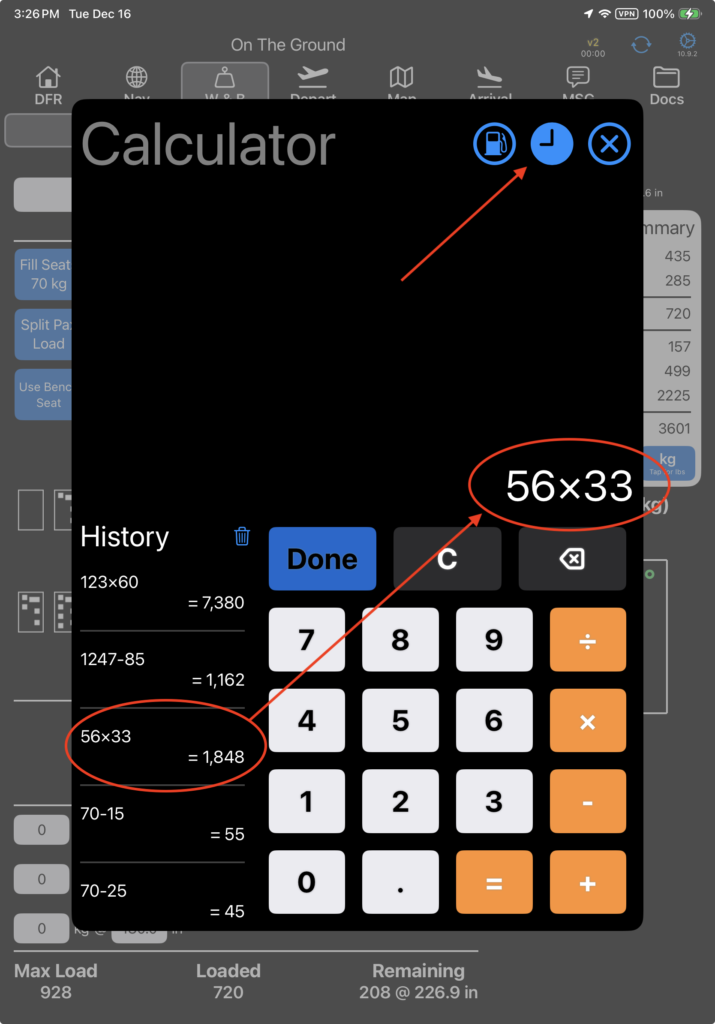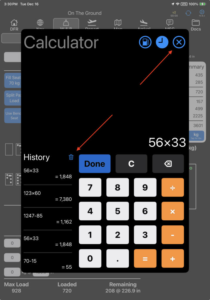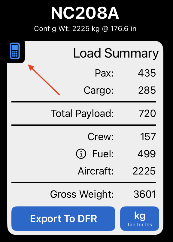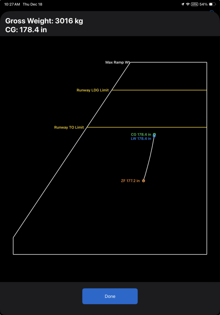 Tap on the envelope to open an expanded view that includes landing and zero fuel weights and applicable weight restrictions.