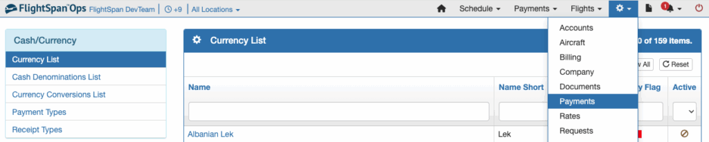 Select Payments from the Settings menu, then select Currency List from the Cash/Currency menu.