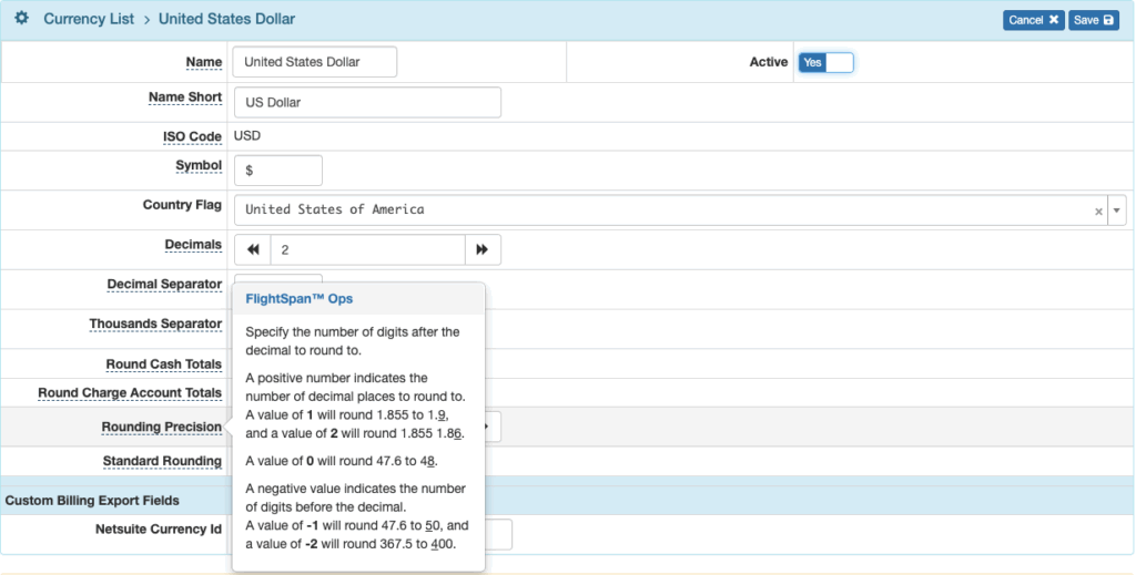 Select the base currency and set the conversion factor to the target currency. (Target currency is the default currency set for your company when you first subscribe to FlightSpan™ Ops.)