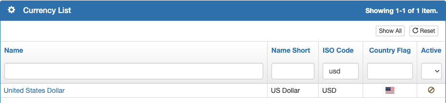 Search for the currency by name or ISO code, enter the denomination, and Save.