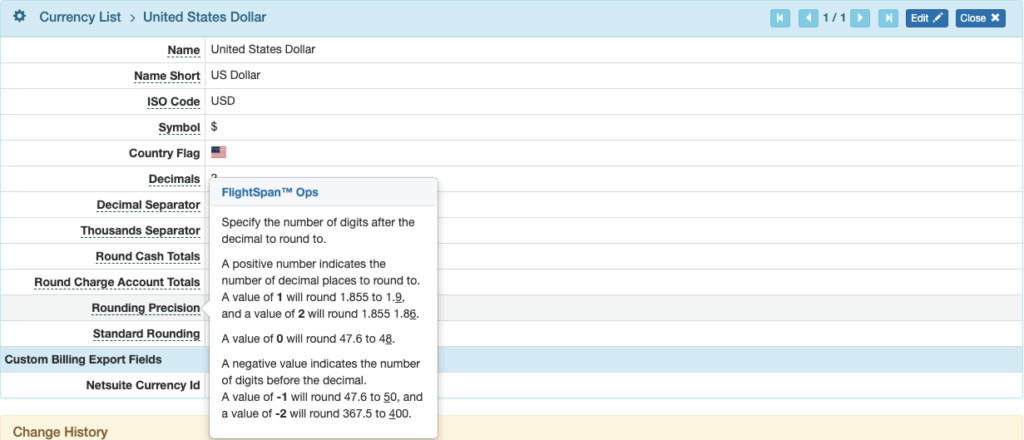 Edit the Currency Settings, including decimals displayed and rounding rules.